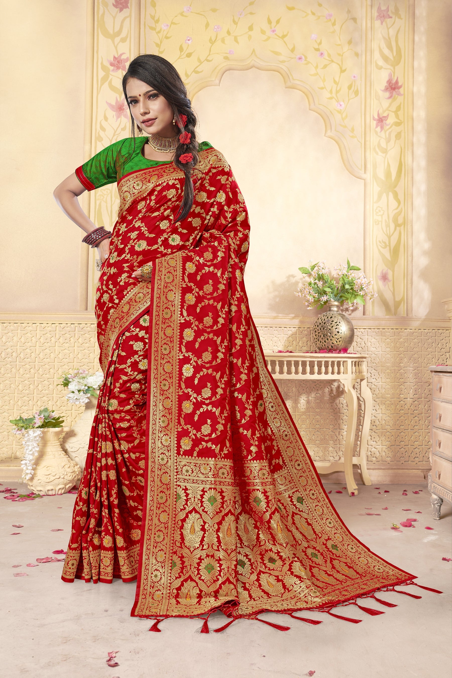 SMSAREE Presents This Red Colour Jacquard Silk Banarasi Saree Which Make Dynamic Appearance In Any Occasions With Stunning And Beautiful Look Made From Jacquard Silk with Beautiful And Classy Embroidered Jacquard Border. It's a Heavy Work Designer Benarasi Silk Saree with a Raw Silk fancy cut blouse. This Saree Is Quite Comfortable To Wear And Easy To Drape As Well.
