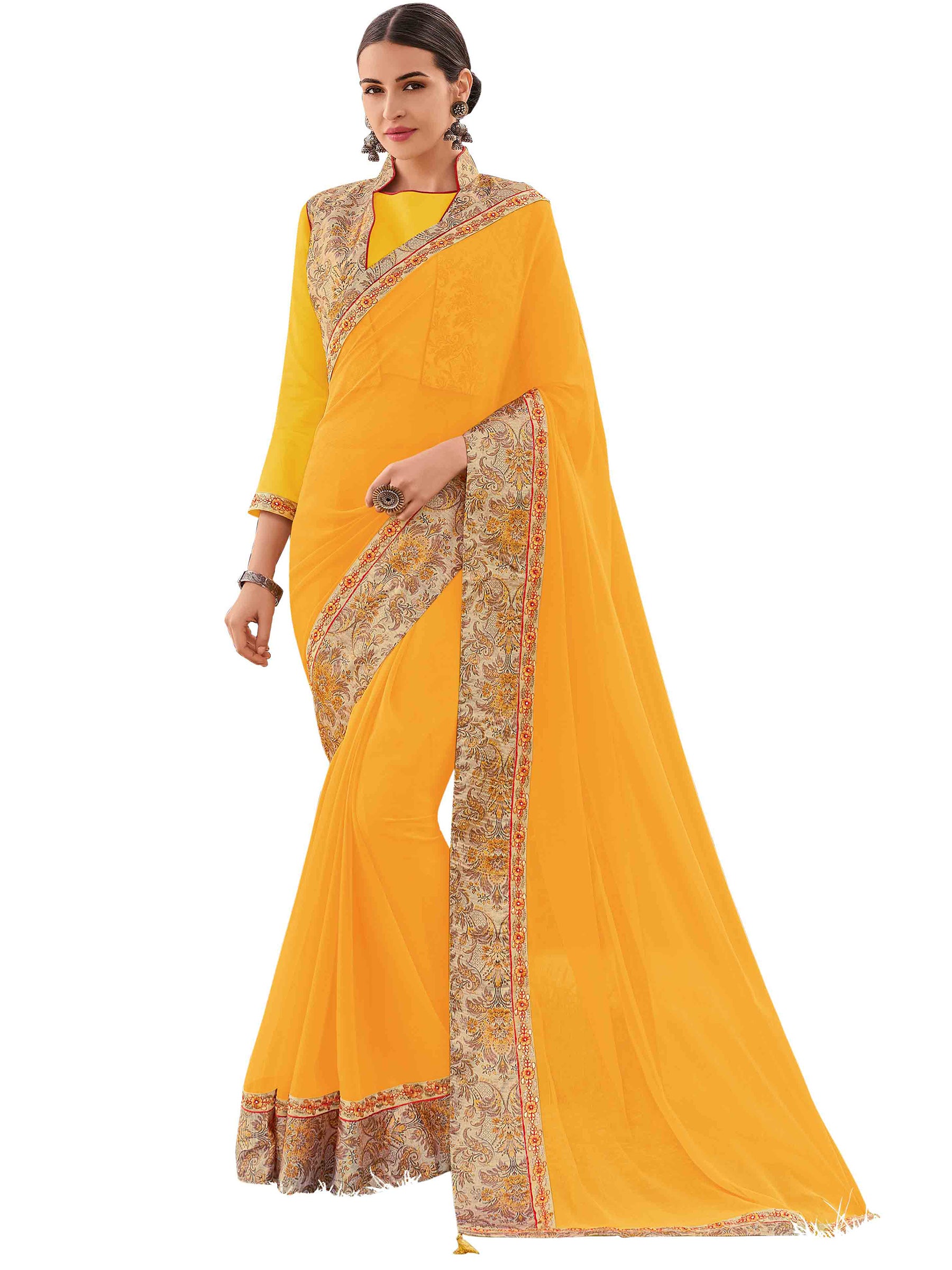 SMSAREE Presents This Yellow colour Chiffon Fancy Designer Saree Which Make Dynamic Appearance In Any Occasions With Stunning And Beautiful Look Made From Chiffon with Beautiful Heavy Border. It's a Fancy Designer Saree with Raw Silk Blouse. This Saree Is Quite Comfortable To Wear And Easy To Drape As Well. * Fabric - Chiffon * Colour - Yellow * Size - Free Size * Length -...